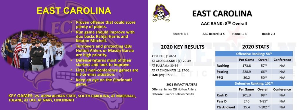 East Carolina’s offense should be exciting to see. They have depth at each level but taking better care of the ball and protecting their quarterback is high priority. ECU’s defense returns plenty of starters with added depth but must improve in all areas including stats to make enough stops. The first three non-conference games could range their record between 3-0 and 0-3 depending on overall performance. They also must outplay some AAC opponents for a chance at bowl-eligibility. Most importantly, the season finale against Cincinnati should be the highlight of the season. For nearly 40 years, Cincy consistently struggled at Greenville, North Carolina. Their only big victory there was 42-26 back in 2002. The Bearcats only won four in 12 all-time meetings there. Cincy’s New Year’s Six Bowl and even a playoff opportunity could ride on this game alone. If they’re unable to overcome the Greenville struggles, East Carolina could have their biggest win of the season in program history.