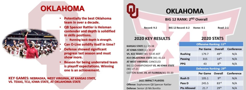 This is my highest ranked Underrated Team since #6 Auburn back in 2015. The rules for conference champs being excluded are exempt for this season thanks to COVID. Anyway, Oklahoma is underrated for one reason…playoffs. They’re 0-4 all-time. They lost to Clemson, and three straight SEC opponents: Georgia, Alabama, and LSU. Why? Defense. For nearly a decade, that hindered them from becoming an elite football team that had an elite offense since Baker Mayfield took the role in 2015. Thanks to defensive coordinator Alex Grinch, who upgraded this porous defense to average in two seasons, they could be what decides Norman’s fate in 2021. Since they return a good amount, including bringing in guys through recruiting and transfers, this could finally be their chance to win their first ever playoff game since it existed in 2014. Clemson, Alabama, Ohio State, and others are reeling from QB replacements. Of the Top 4 teams ranked in the AP polls, Oklahoma is the one with the experienced quarterback. Winning a playoff game would be a huge step forward in the program’s progress of being truly elite.