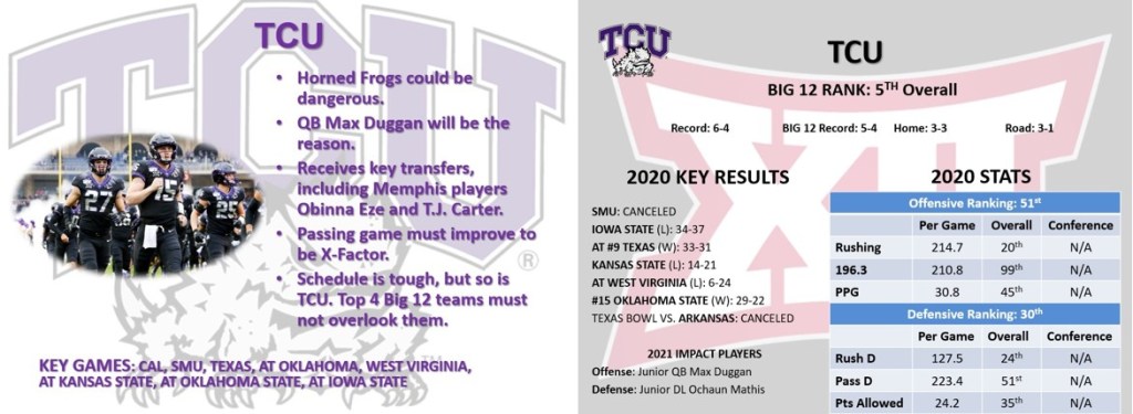 TCU looks poised for a surprising year, and the Big 4 must be prepared for them. The obvious strength comes from special teams and defense. That’s all they need to disrupt some good competition in the Big 12. For them to survive and conquer the Big 12, their offense must come through. That starts with quarterback Max Duggan. He’s an agile runner and a capable thrower. If he’s half as good as Trevone Boykin, watch out for TCU. However, lessening turnovers and taking care of the ball are top priorities. They also have a challenging road schedule against Oklahoma, Kansas State, Oklahoma State, and Iowa State. Defense travels and TCU’s versatile athletes, run game, and tricky play-calling should give them plenty of opportunity. Duggan’s passing and right amount of big plays will be the X-factor for the Horned Frogs this season.